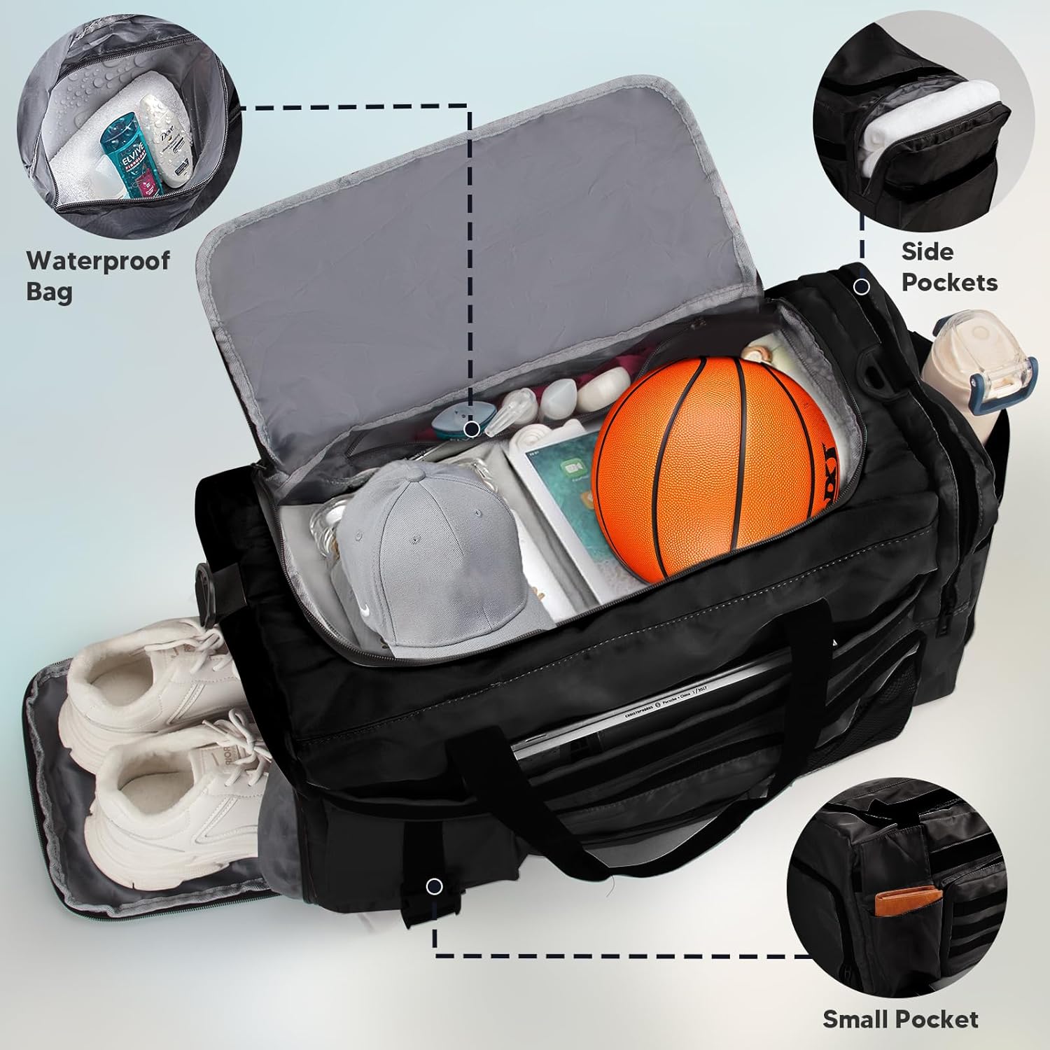 🎾 Gemakkelijk te Dragen: De trainingstas heeft een gewatteerd handvat en afneembare schouderriem, evenals een verborgen verstelbare schouderriem die kan worden verwijderd van de onderkant en bevestigd met een antislip gesp, waardoor hij gemakkelijk te gebruiken is als rugzak. Meerdere draagmethoden maken uw reis gemakkelijker.
