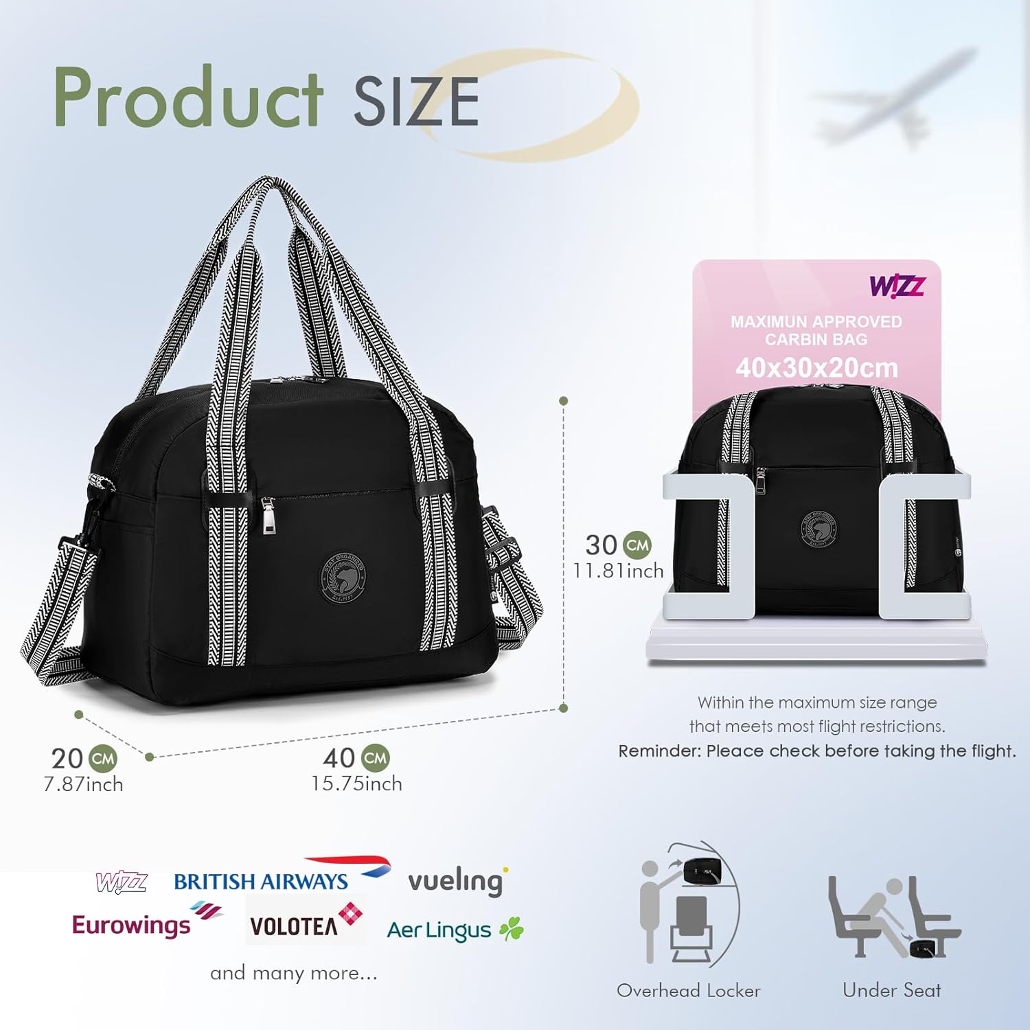 【Equipaje de mano 40x30x20】La bolsa de viaje BAGZY tiene un tamaño de 40 x 30 x 20 cm (15,7 x 11,8 x 8 pulgadas) y cabe fácilmente en la caja de equipaje de mano de Wizzair, Volotea y también de easyJet, Lufthansa, Flybe y TUI Airways. KLM, etc. Ahorra su presupuesto de viaje y no hay cargos adicionales por equipaje, ya que se puede guardar fácilmente debajo del asiento o en el equipaje. compartimento.