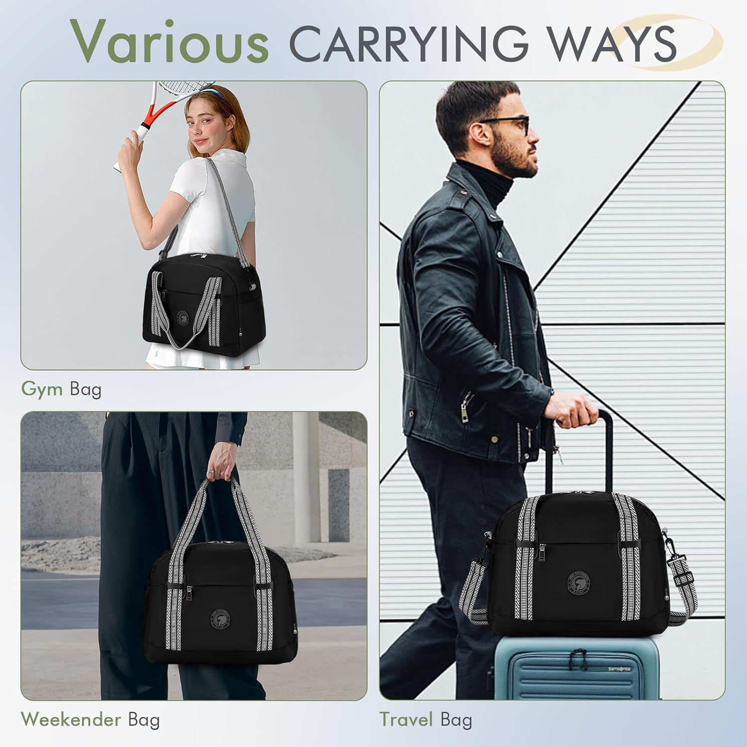 【3 Formas de Transporte】Las bolsas de viaje BAGZY se pueden llevar al hombro con sus correas desmontables, se pueden ajustar de 60 a 108 cm y se adaptan a diferentes tipos de cuerpo. También puedes utilizarlo como bolsa de gimnasio con el asa superior o colocarlo en un carrito para tener la mano libre.