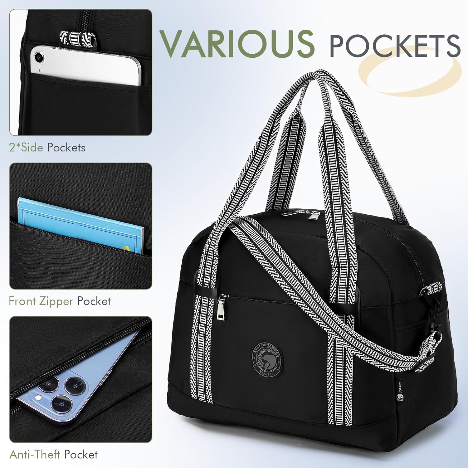 【Gran capacidad de 25 litros】Este equipaje de mano tiene un compartimento grande, lo suficientemente grande como para acomodar su ropa diaria, manta, toalla, auriculares, revistas, etc. Dentro del compartimento hay 5 bolsillos de malla para sus pañuelos, toallitas húmedas y kit de viaje. etc. También hay bolsillos laterales para el paraguas y 2 minibolsillos para el teléfono móvil, el pasaporte, la cartera o el billete de avión.