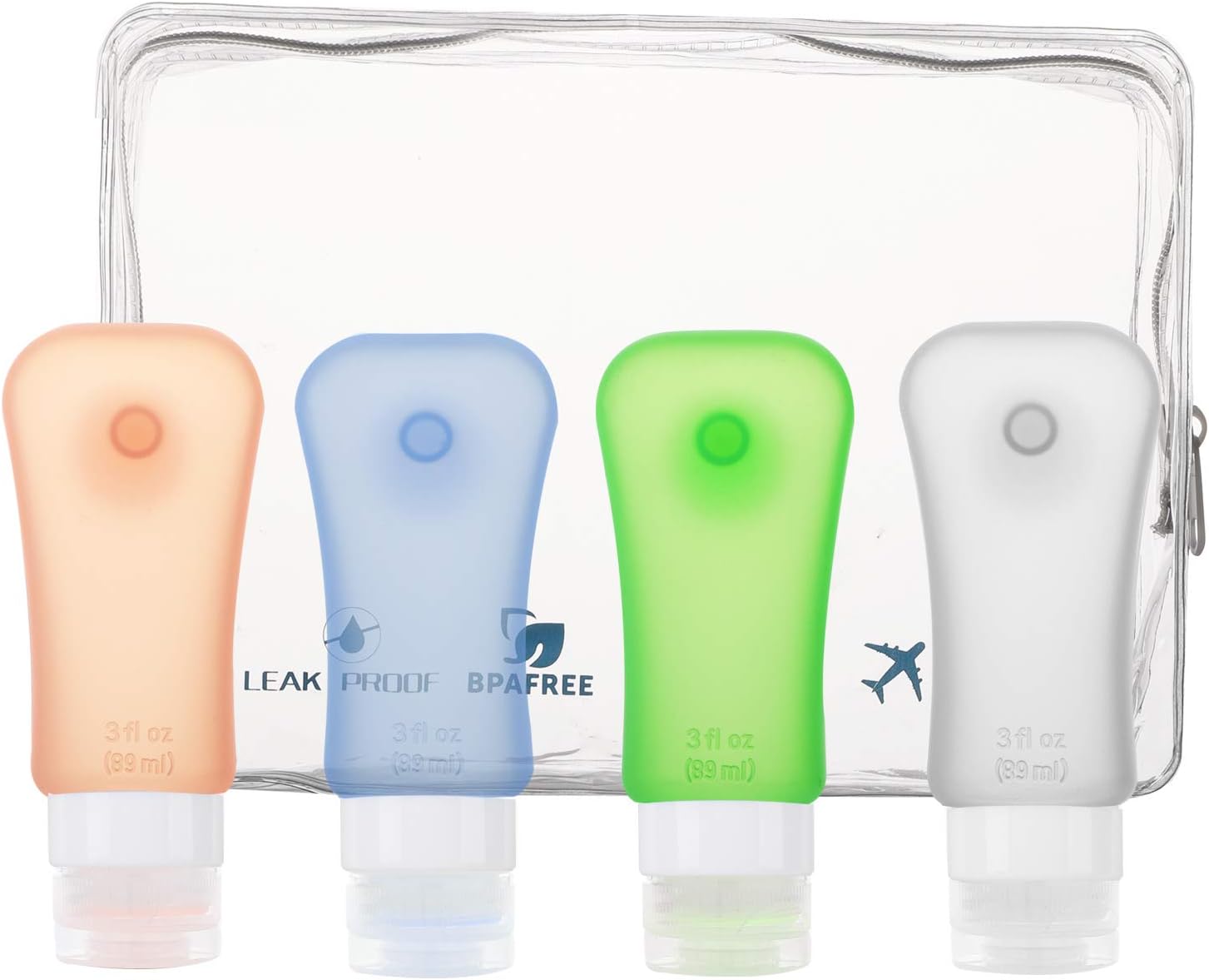 MoKo Reisflessenset, 4 stuks siliconen lekvrije reiscontainers, lekdicht, navulbare reisflessen, BPA-vrij, reisfles voor shampoo, toiletartikelen, spoeling, verzorgingsproducten, 89 ml
