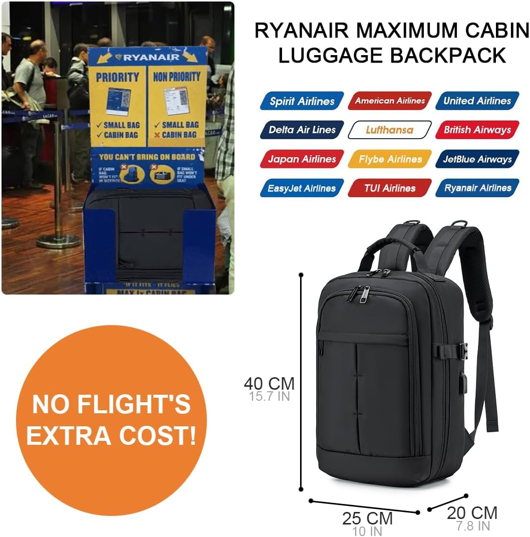 Handbagagerugzak 40x20x25cm: De maat van de SPAHER-laptoprugzak is Precies de maximale maat die gratis in de cabine mag worden vervoerd bij het vliegen met Ryanair 40x20x25cm/20L, ook perfect om te functioneren als een kleine rugzakcabine achterin de stoel. Het wordt ook geaccepteerd door vrijwel alle grote luchtvaartmaatschappijen over de hele wereld; Waaronder easyJet, British Airways, Lufthansa, Quatar, Wizz Air en nog veel meer vluchten.