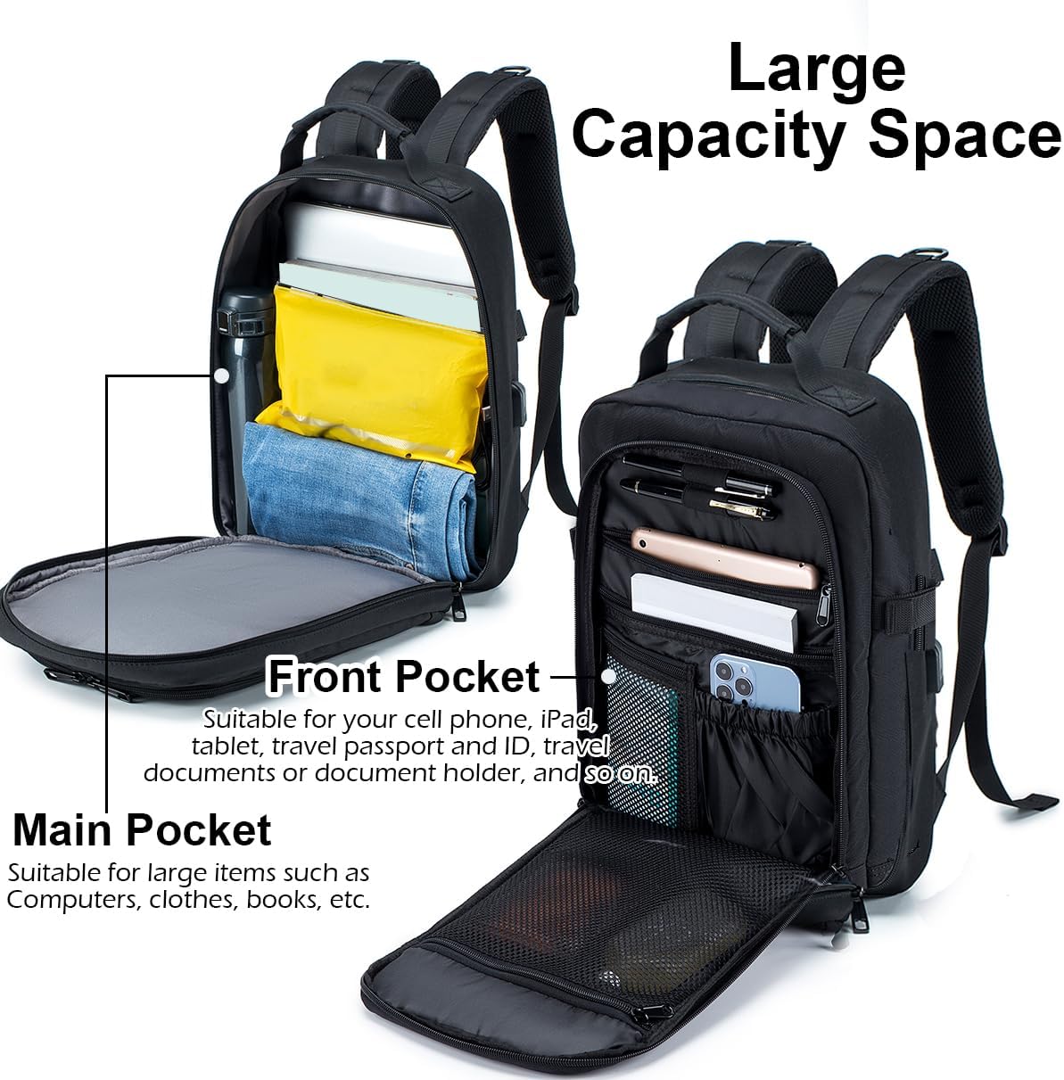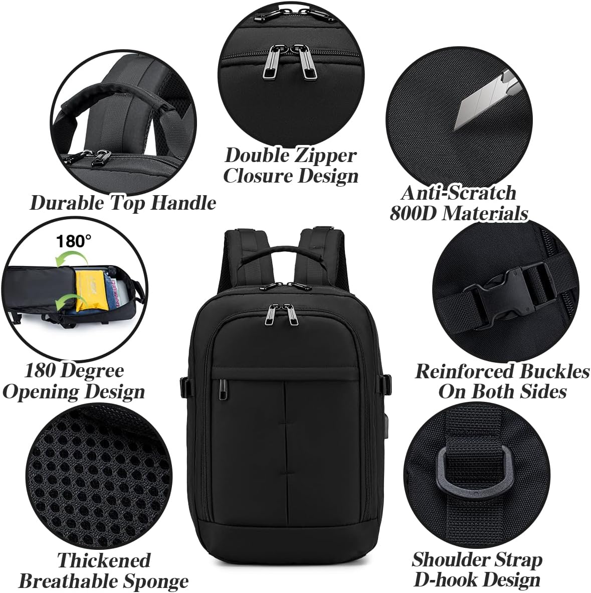 Reisrugzak met Meerdere Draagstijlen: hij heeft een handvat aan de bovenkant om hem met de hand te dragen of 2 comfortabele en ademende banden om hem op de schouders te dragen. Of als u reist met een grotere handbagagekoffer of reistas, heeft deze een speciale bagagebevestigingsriem aan de achterkant, zodat u deze rugzak kunt bevestigen aan uw uitbreidbare kofferhandgreep op wielen. Gemakkelijk uw handen vrij!