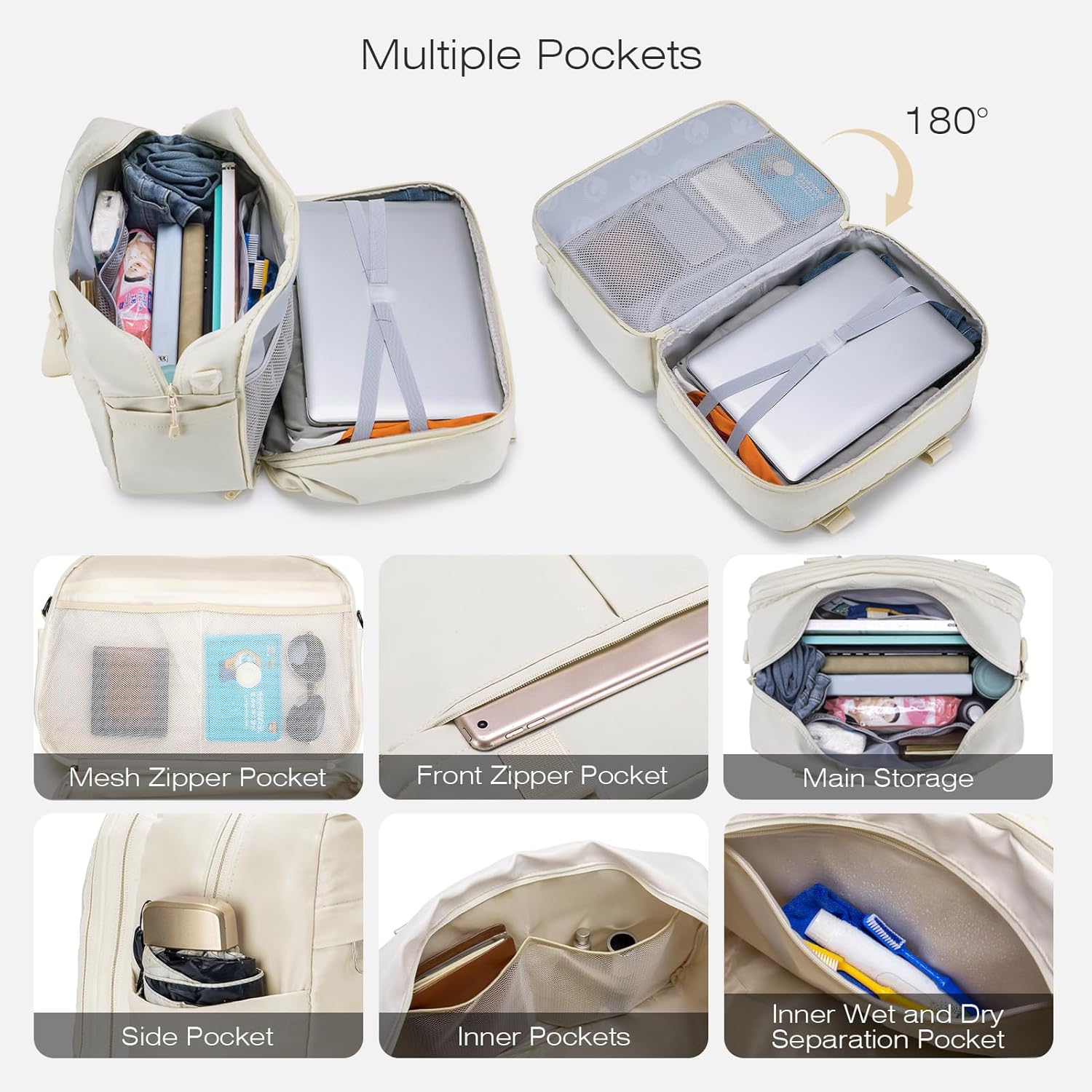 Volledig Openend Ontwerp: het beschikt over een groot voorvak voor snelle toegang tot items, 2 open vakken aan de zijkant, 2 gaasvakken en 1 droog en nat apart ritsvak in het hoofdvak, 1 groot uitbreidbaar hoofdvak tot 180 graden volledig geopend, groot genoeg om past bij uw dagelijkse kleding, deken, handdoek, tissues, vochtige doekjes, toiletartikelen en meer.