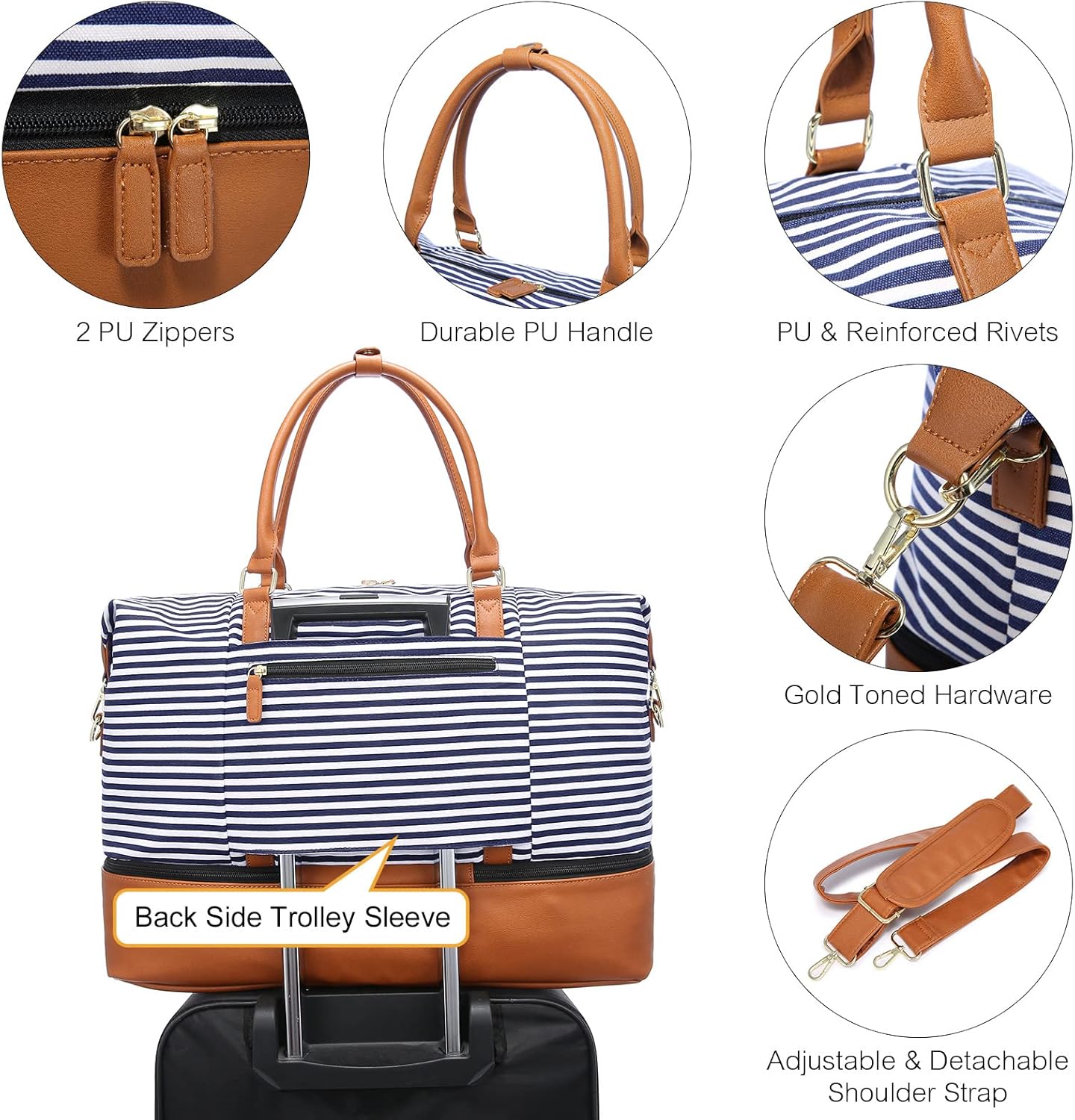 Ideaal voor op reis: de onderkant van de weekendtas heeft 5 metalen noppen om hem uit de buurt van de grond te houden, zodat je hem onder de stoel kunt plaatsen. De stoffen riem aan de achterkant kan gemakkelijk door de bagagehandgreep met wielen worden gedragen.