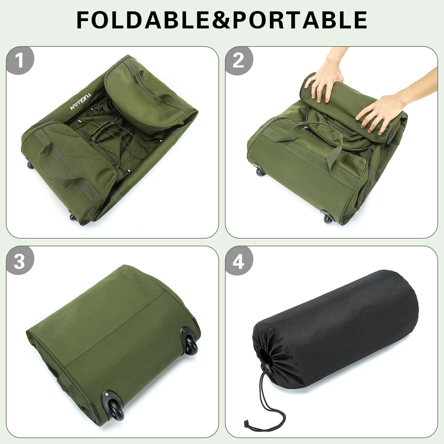 Opvouwbaar: wordt geleverd met een gratis zakje om ruimte te besparen door de roltas op te vouwen en in de draagtas te verpakken wanneer deze niet in gebruik is. Gevouwen formaat is 16 x 7,5 x 6 inch.