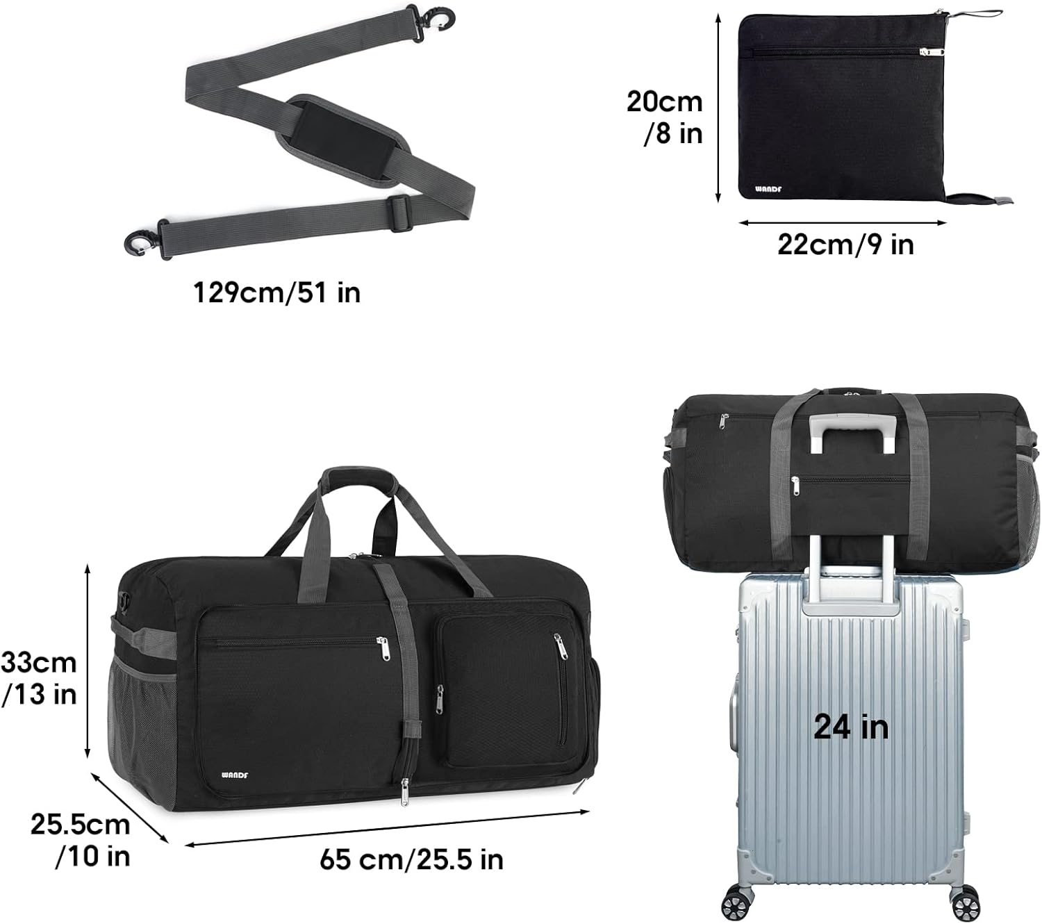 GROTE CAPACITEIT EN OPVOUWBAAR: De WANDF-weekendtas meet 65 x 25,5 x 33 cm en voldoet aan de meeste zakenreisbehoeften. In de ruime ruimte van 65 liter passen met gemak 3-5 dagen aan dagelijkse benodigdheden. Opgevouwen formaat: 29*26,7*7,6 cm, die kan worden gebruikt als just-in-case tas in uw koffer.