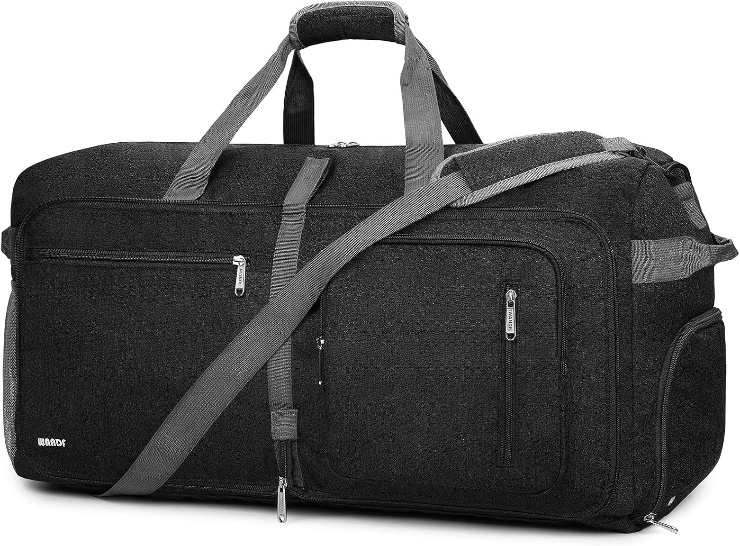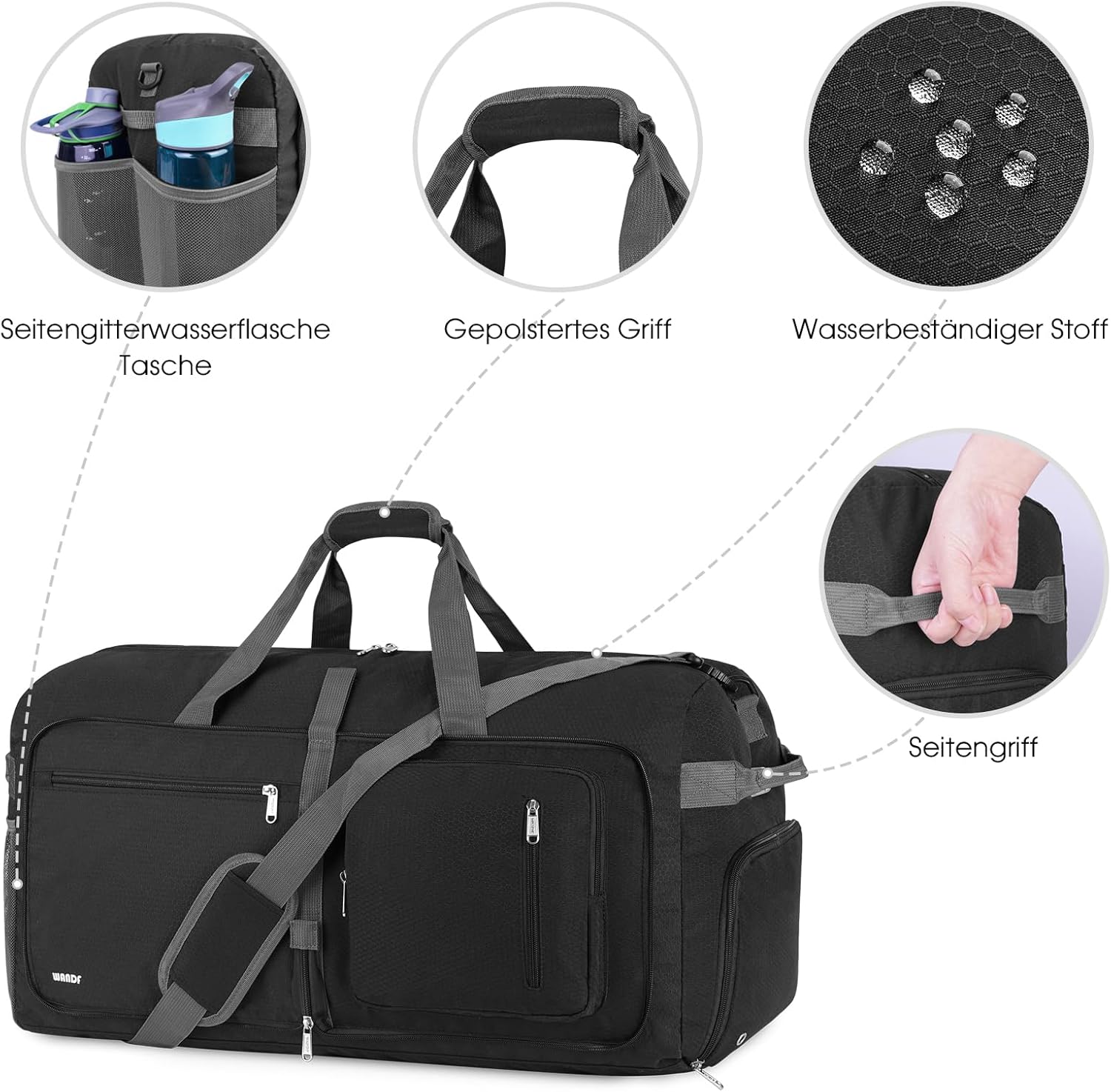 WANDF grote opvouwbare plunjezak voor onderweg met schoenenvak en droog/nat scheiding. Gebruik hem als reis-, overnachtings-, weekendbagage, sport-fitness handbagage voor mannen en vrouwen. In de ruime ruimte van 65 liter passen met gemak 3-5 dagen aan dagelijkse benodigdheden.