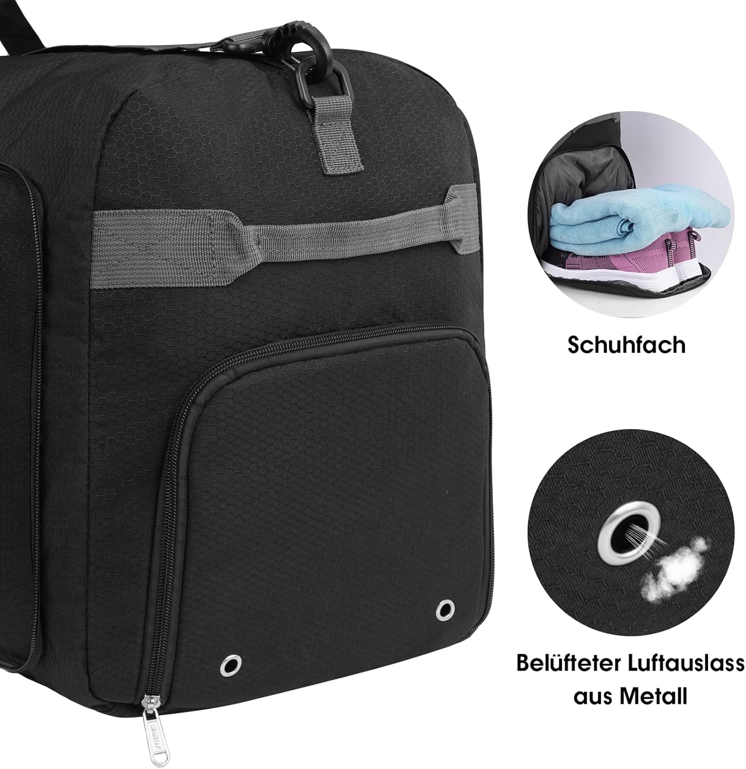 Schoenenvak: WANDF-reistassen zijn uitgerust met 1 schoenenvak aan de zijkant met twee geventileerde metalen sleuven, perfect voor het opbergen van schoenen of spullen die geïsoleerd moeten worden.